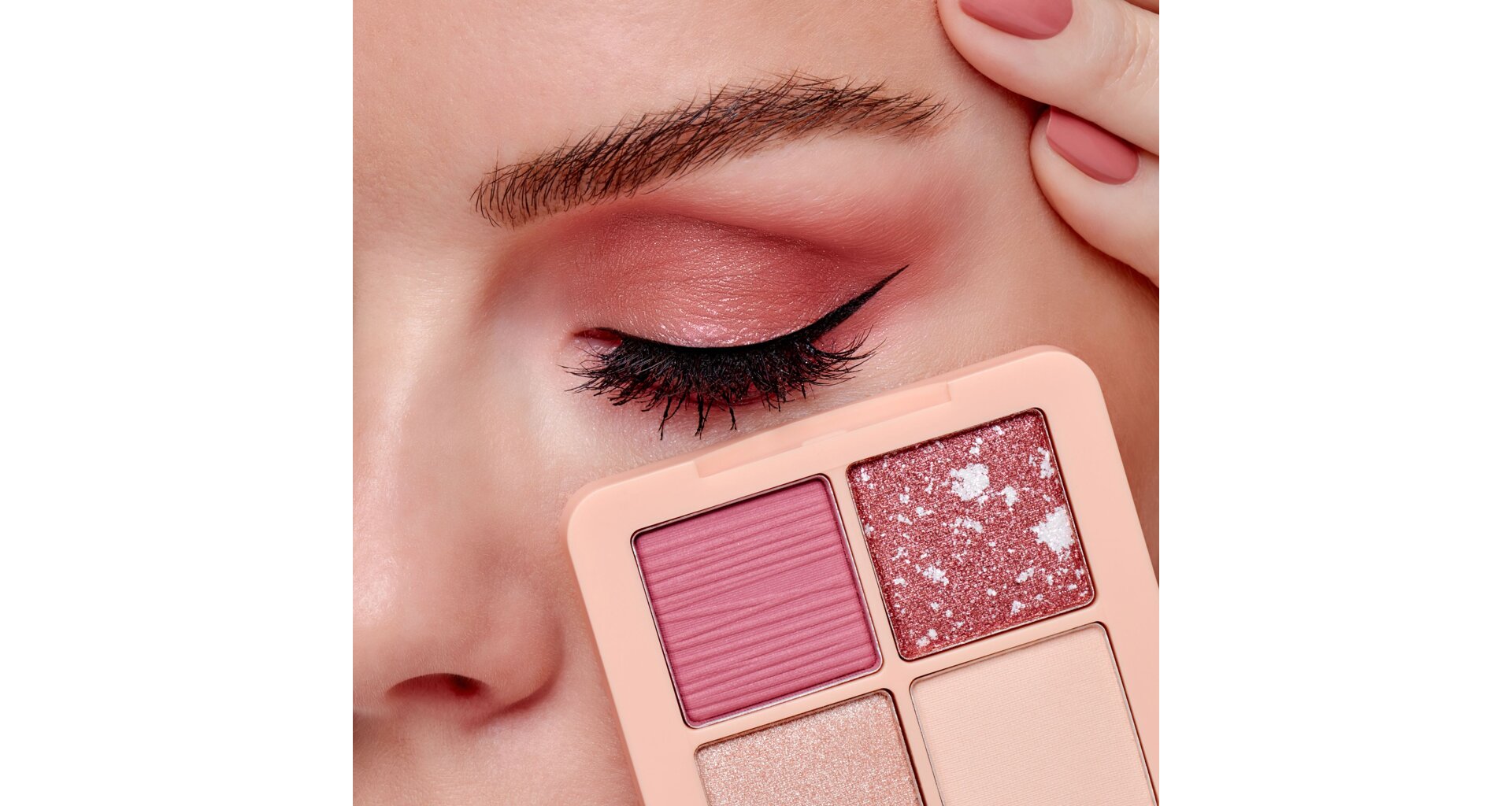 Paletka 4 očních stínů pro vytvoření růžového nude looku. Paletka kombinuje matné a třpytivé odstíny, které na očích vytvářejí nádherný 3D efekt. Oční stíny mají hebkou texturu a velmi snadno se s nimi pracuje. Lze nanášet prsty nebo štětcem.